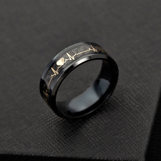 Black and Gold Heartbeat Carbon Fiber Inlay Tungsten Ring